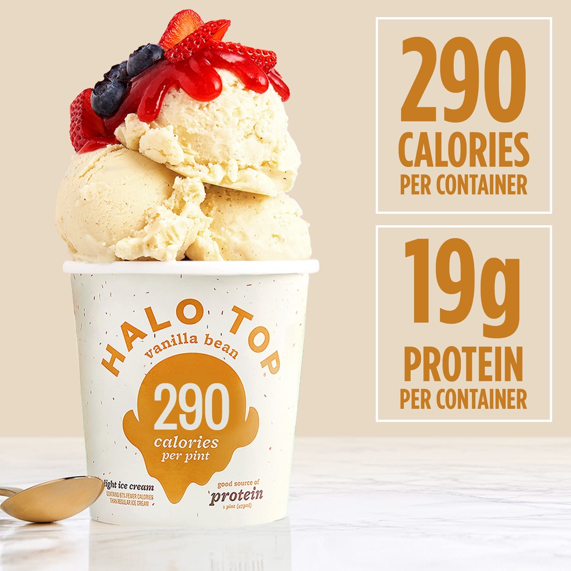 Halo Top LowCalorie Vanilla Bean Light Ice Cream Pint, 16 fl oz ... Nutrition facts. Refer to the product label for full dietary information, which may be available as an alternative product image. 3 Servings Per Container. Serving Size ... Halo Top Vanilla Bean is a good source of protein and at only 290 calories per pint, you'll want to visit this classic flavor again and again. Smart Indulgence: Lower in ...