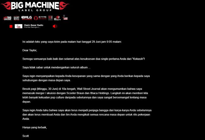 Taylor Swift's Battle With Big Machine Records: A Timeline - MSN The Big Machine founder vowed to "set some things straight" in a June 2019 post on the label's website titled "So, It's Time For Some Truth." He claimed he "personally texted Taylor ...