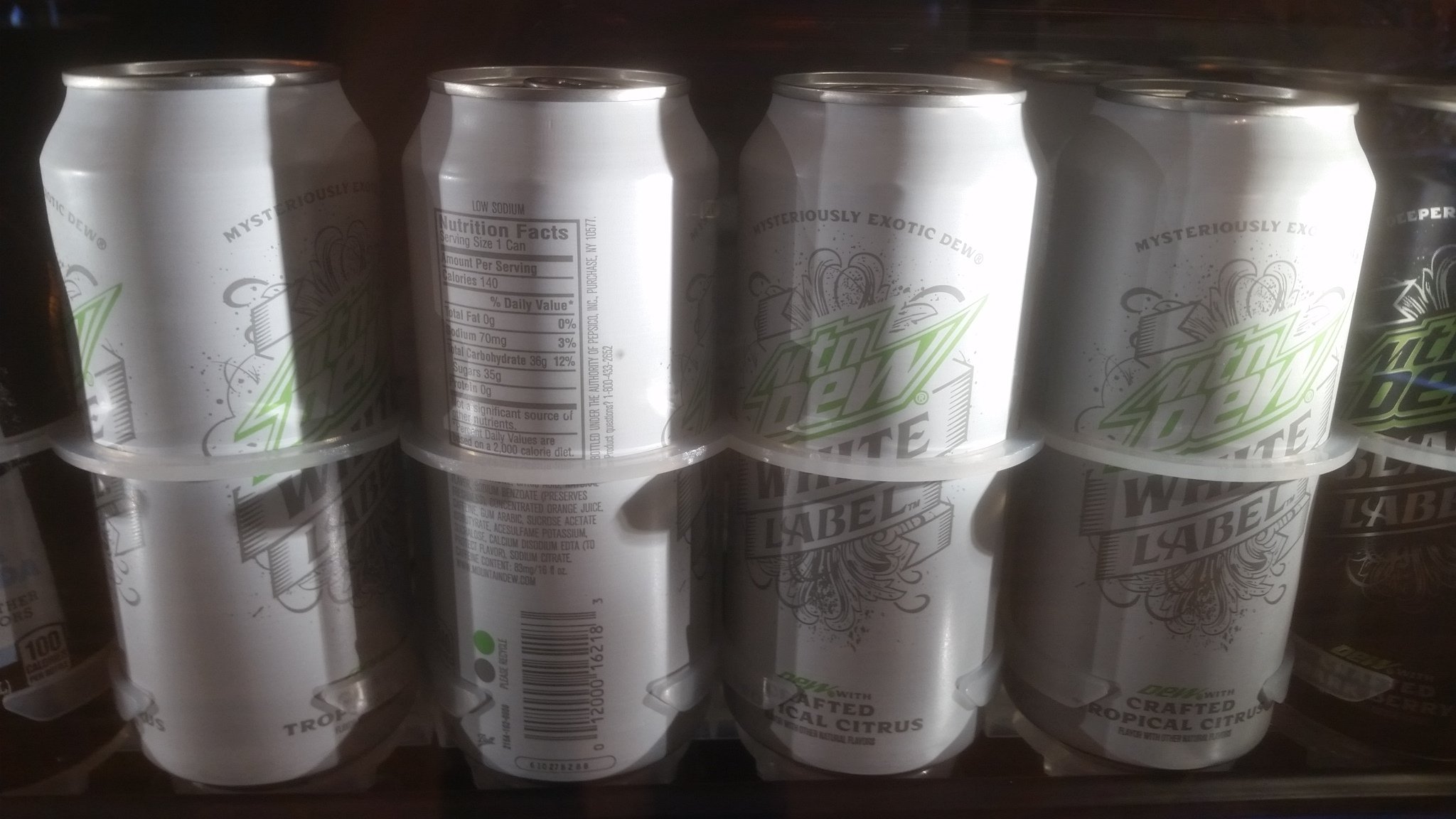 Mountain Dew White Label Soda, with Crafted Tropical Citrus Flavor with other natural flavors. Mysteriously exotic Dew. Product questions? 1-800-433-2652. 140 calories per can. Low sodium. Caffeine Content: 84 mg/16 fl oz. . Partially produced with genetic engineering. Please recycle.