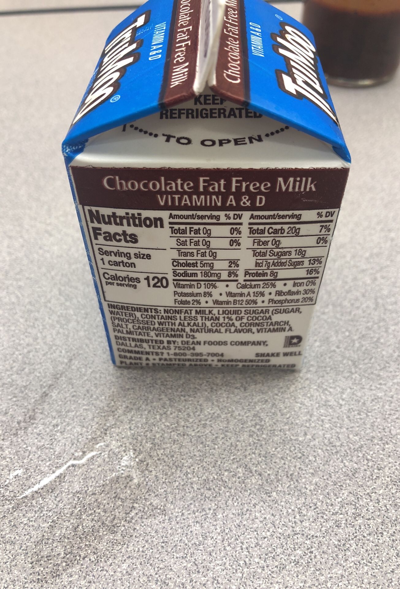 1% Chocolate Milk Small Carton - Nutrition Facts - MyNetDiary There are 140 calories in carton of 1% Chocolate Milk Small Carton by Trumoo from: Carbs 20g, Fat 2.5g, Protein 8g. Get full nutrition facts for your ... TruMoo Fat Free Milk, Chocolate: Calories, Nutrition Analysis ... Nutrition · Serving Size: 1 carton · Amount per Serving My Daily Value · Calories 120Kcal 7% · Total Fat 0g 0% · Saturated Fat 0g 0% · Trans Fat 0g 0% · Cholesterol 5 ... Carbs in Garelick Farms Trumoo Chocolate Milk Garelick Farms Trumoo Chocolate Milk (240 ml) contains 19g total carbs, 19g net carbs, 2.5g fat, 8g protein, and 140 calories.