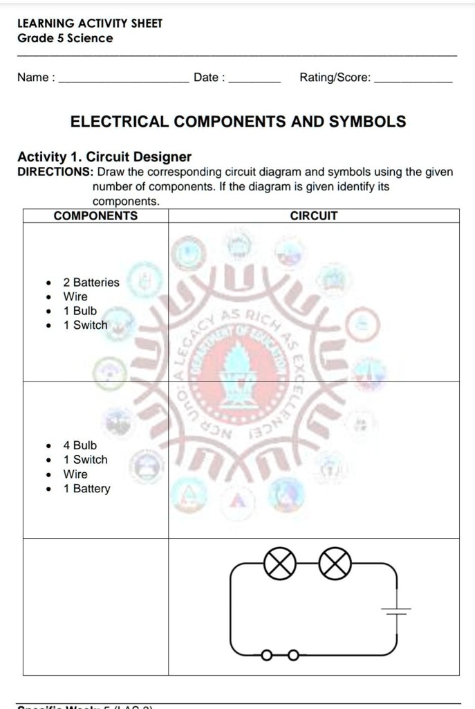 Electric Circuits Flashcards | Quizlet a light bulb Jamal draws the circuit diagram shown. How many of each component are shown in the diagram? Check all that apply. -one battery -two switches -two resistors -three light bulbs Patty makes a table of the symbols used for the parts of an electric circuit. What label should Patty place in the marked cell? Resistor