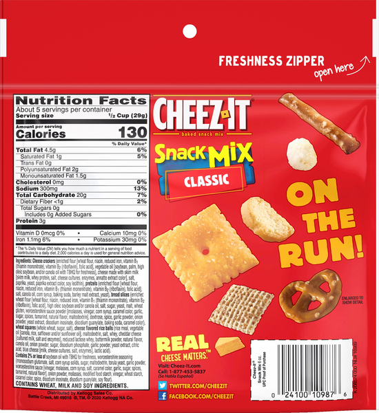 Cheez it nutrition facts. › calories-nutrition › cheez-itCalories in Cheez-It Crackers and Nutrition Facts - FatSecret Aug 23, 2020 · Cheez-It Crackers Nutrition Facts Serving Size 1 pouch (28 g) Amount Per Serving Calories 140 % Daily Values* Total Fat 7.00g 9% Saturated Fat 1.500g 8% Trans Fat 0.000g Polyunsaturated Fat 3.500g Monounsaturated Fat 2.000g Cholesterol 0mg 0% Sodium 210mg 9% Total Carbohydrate 16.00g 6% Dietary Fiber 1.0g 4% Sugars 0.00g Protein 3.00g Vitamin D › en_US › productsCheez-It® White Cheddar Baked Snack Crackers | Cheez-It® Ingredients. Ingredients: Enriched flour (wheat flour, niacin, reduced iron, vitamin B1 [thiamin mononitrate], vitamin B2 [riboflavin], folic acid), vegetable oil (soybean and palm oil with TBHQ for freshness), white cheddar cheese (milk, cheese cultures, salt, enzymes). Contains 2% or less of salt, whey, cheddar cheese (milk, cheese cultures ... › en_US › productsCheez-It® Original - Kellogg's the original flavored cheez-its are great for anybody who wants to eat something at a party, bring to school for lunch, or just need something to crunch on while watching TV. albeit a landmark for every cheesy snack yet to come, the original, being original, only has one main flavor: cheese. nothing wrong with that, just seems a bit plain … Carbs in Sunshine Cheez-It - Original