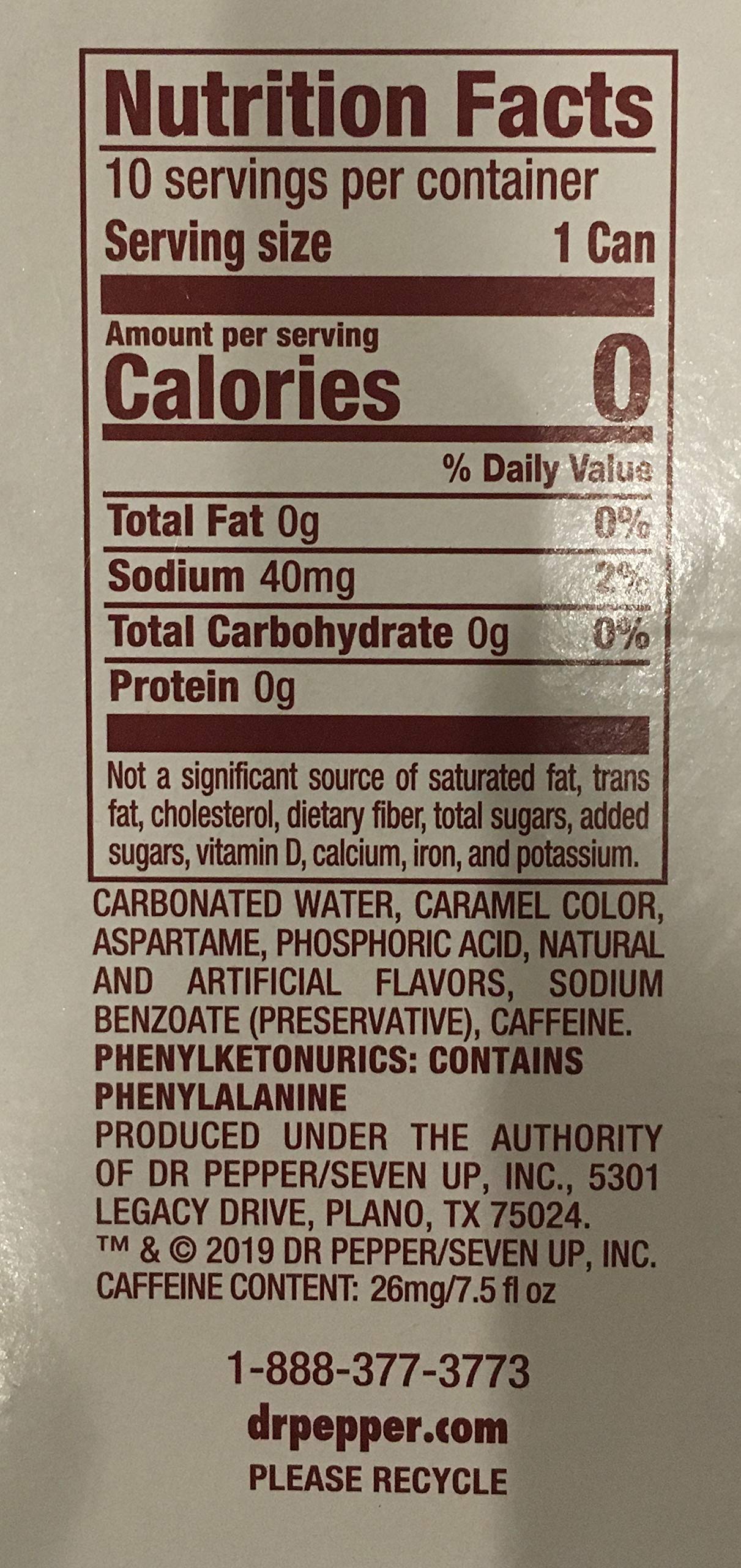 › nutrition › beveragesDr. Pepper 12 Oz Can Pack of 32 Nutrition Facts & Calories KEY FACTS. Has low calorie density - this means that the amount of calories you are getting from an ounce is low (0 cal/oz). Does not contain any risky components such as sodium, cholesterol, saturated fat and added sugar! This item has no fiber content (0% of DV/100g).